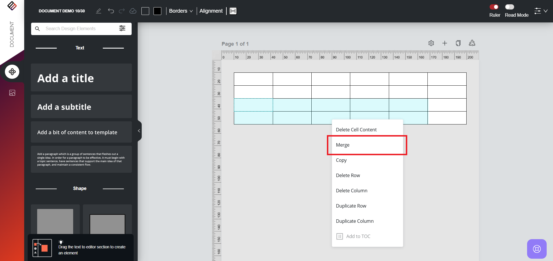To merge cells, click on the starting cell, hold the Shift key, and select the cell where the merge should end. This will highlight all cells in between. Right-click and choose the Merge option to complete the merge.