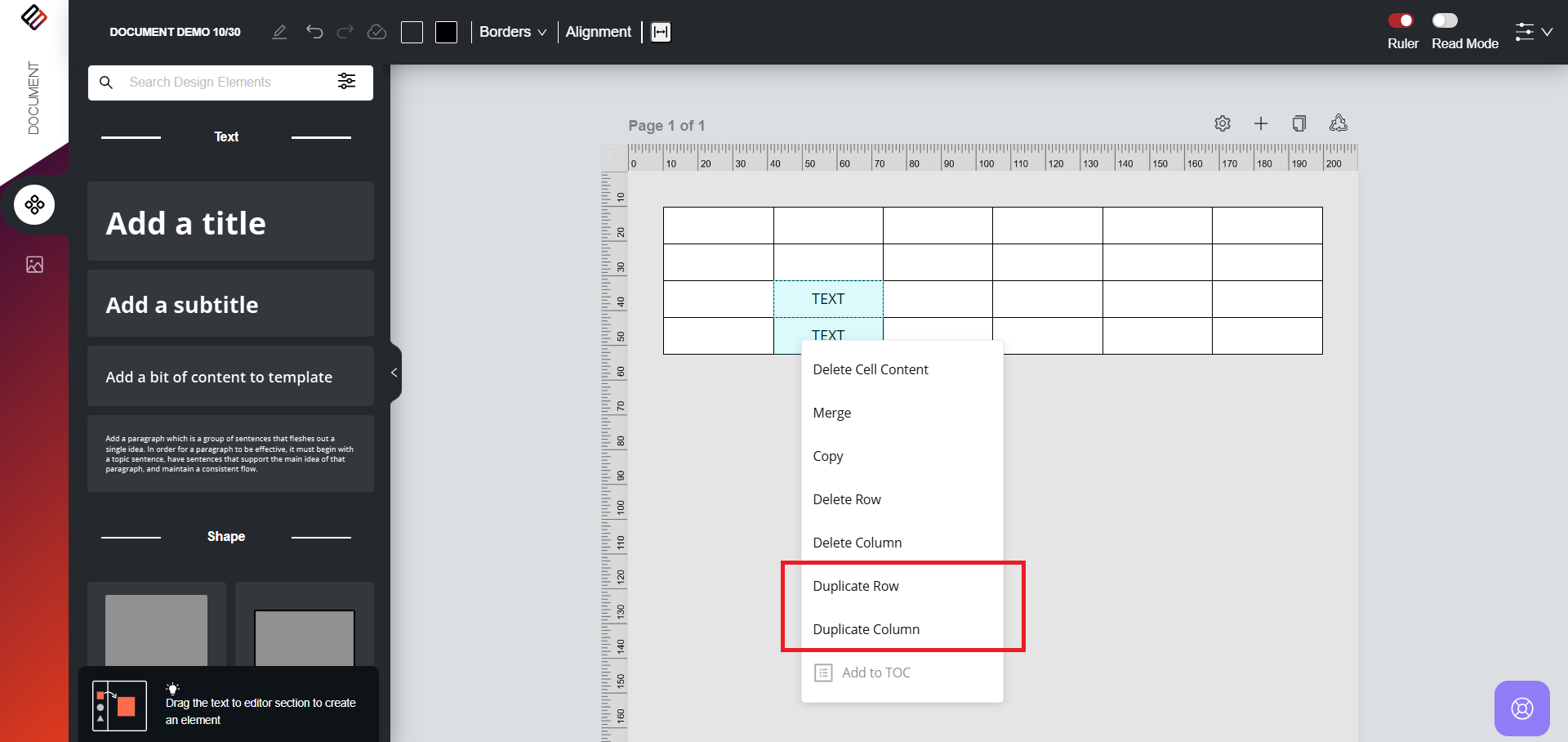 Select the cells you wish to duplicate, right-click, and choose Duplicate Row or Duplicate Column to create a copy of the selected cells, including their content.