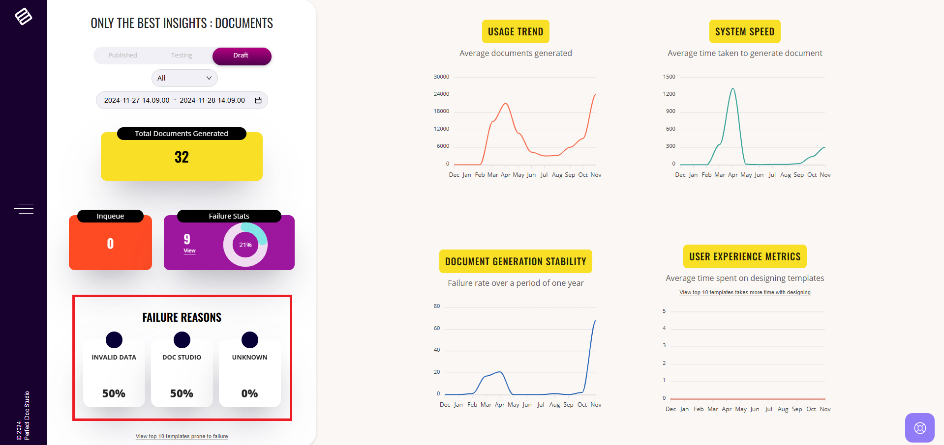In rare instances, technical glitches may cause DocStudio itself to fail in generating a document. This section captures statistics related to DocStudio Errors, providing insights into any technical hiccups affecting the document generation process.