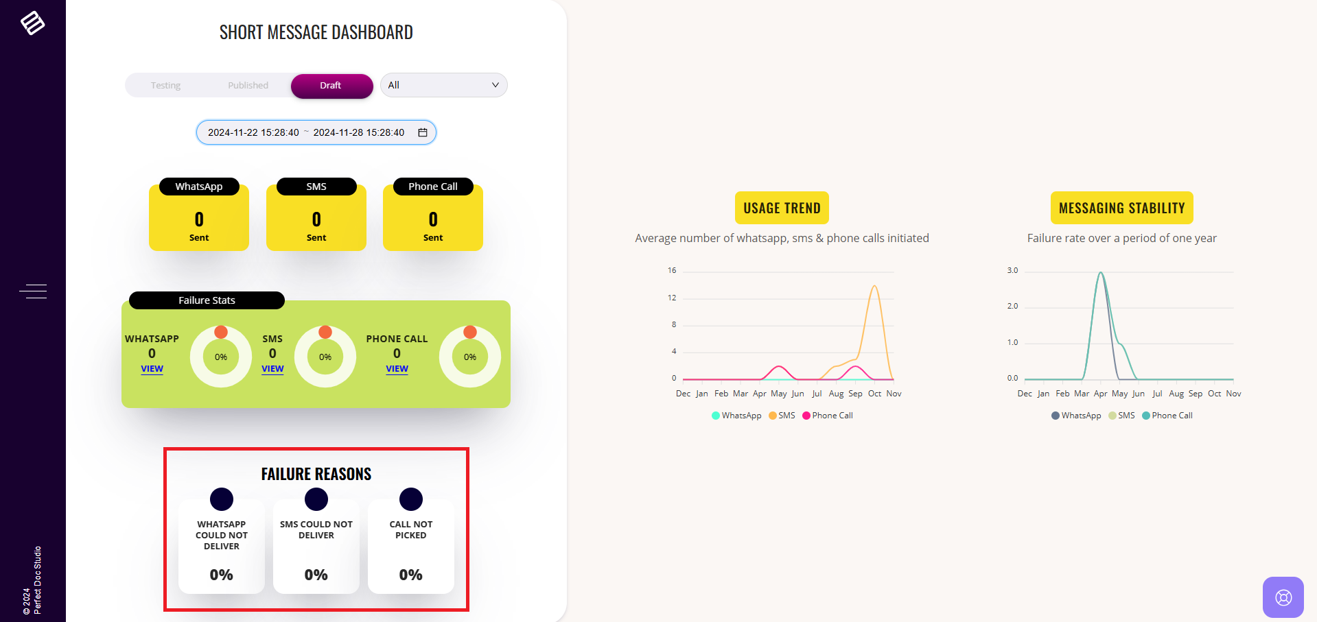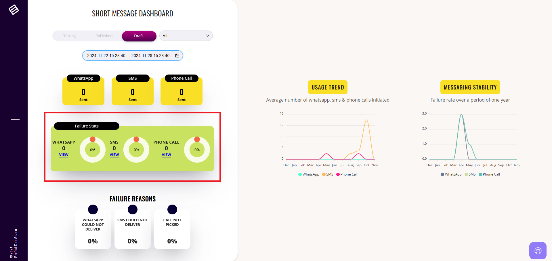 Below the Short Messages Dashboard section, there is a dedicated segment presenting Failure Statistics. This section highlights the percentage of Short Messages that were not successfully delivered, contrasted with the total number of Short Messages (WhatsApp, SMS and Phone calls from the system).