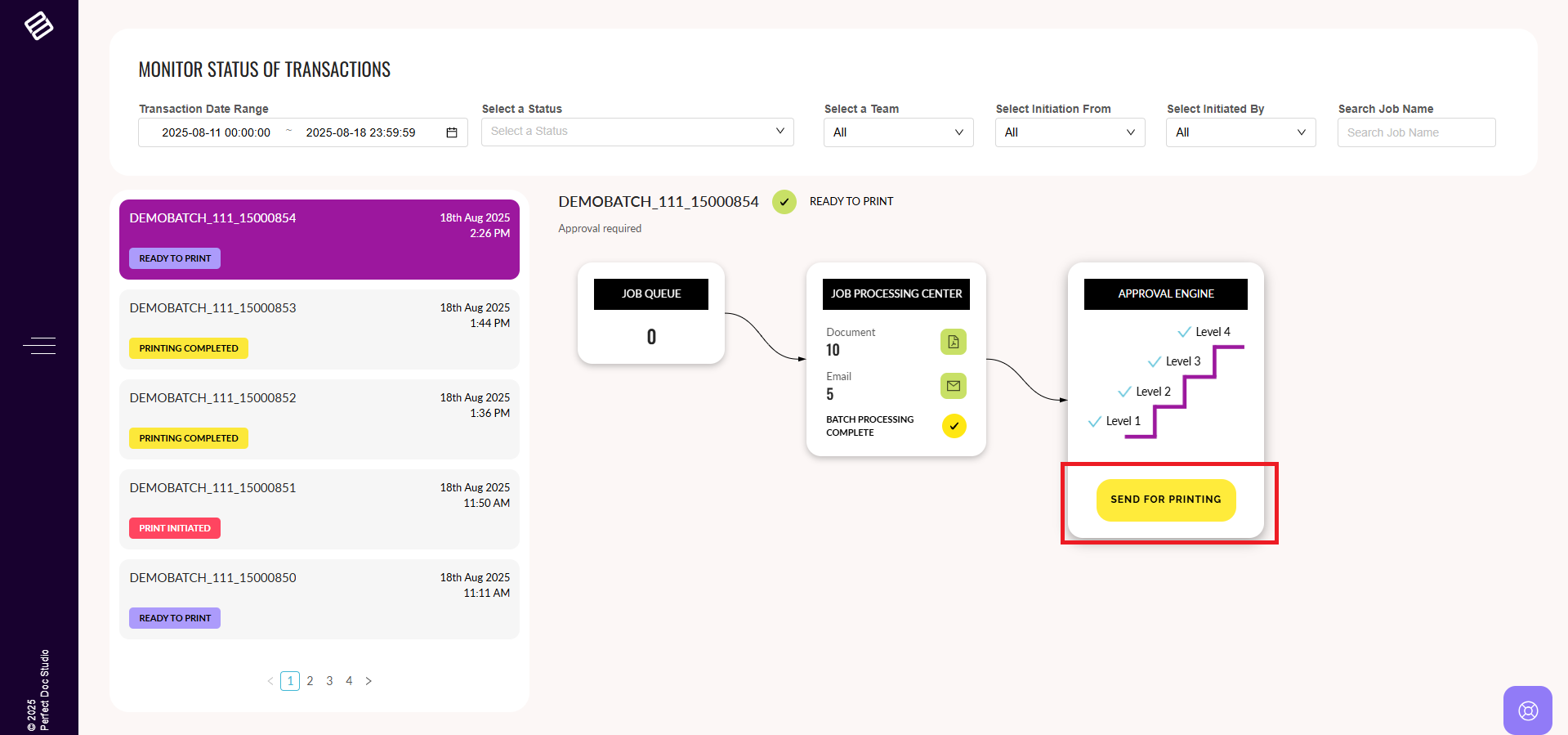 The Approval Engine in Perfect Doc Studio is the module where jobs are reviewed and approved prior to printing. This process is applicable only when jobs are submitted through external APIs (e.g., Postman) with the approval flag enabled. How It Works ...