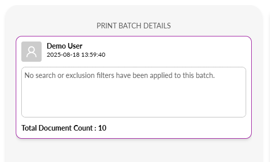 If the user has excluded any documents from printing, those will be displayed here. In this batch, no documents are shown since none have been excluded from printing: