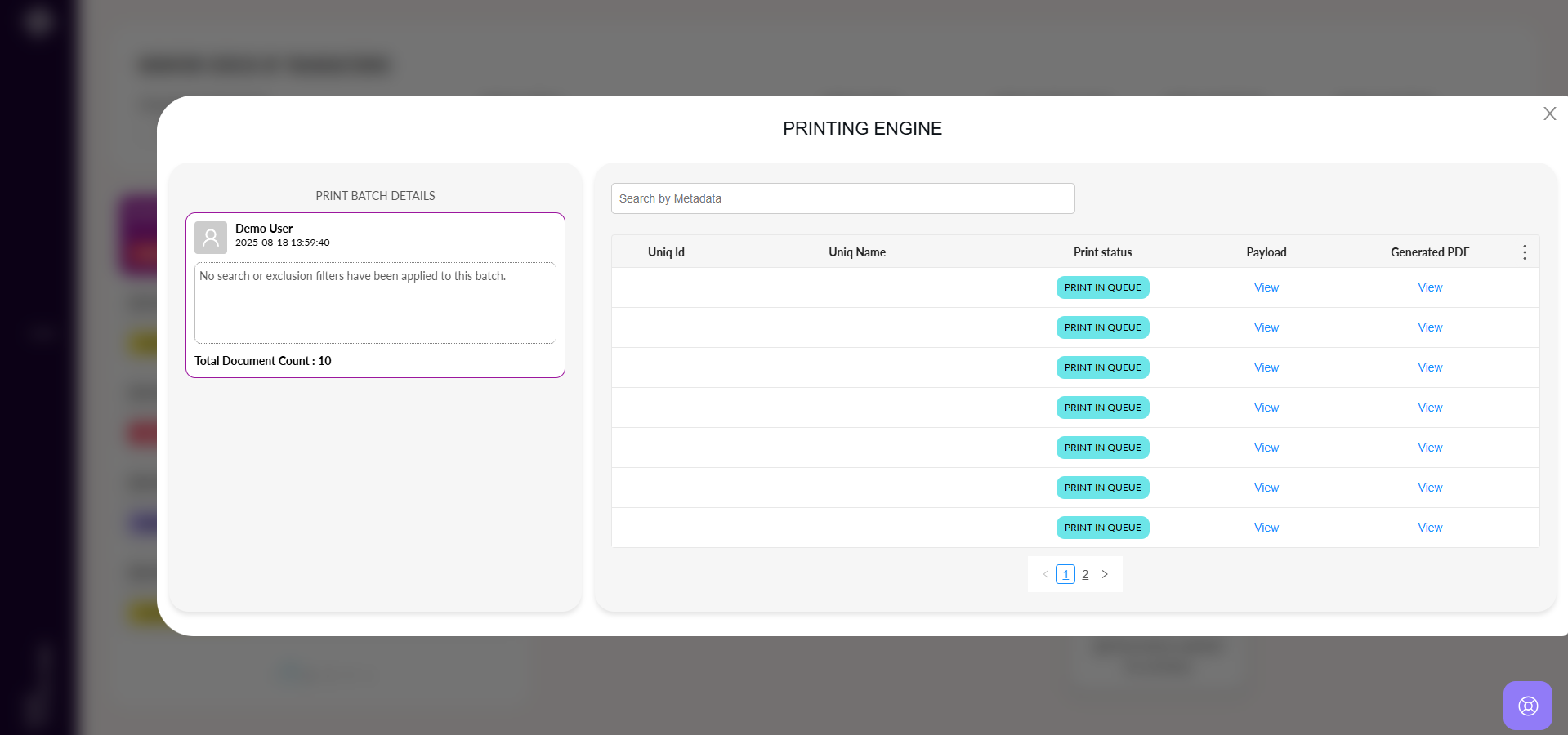 Once the jobs are approved and sent for printing from the Printing Dashboard by clicking the Send for Printing button, they are queued in the Printing Engine, which displays the number of jobs awaiting printing in the current batch. Printing is triggered through an external API call, where the jobs are routed to a third-party or external print server. After the printing process is completed, the external server sends a status response back to Perfect Doc Studio, updating the system to reflect whether each document has been successfully printed.