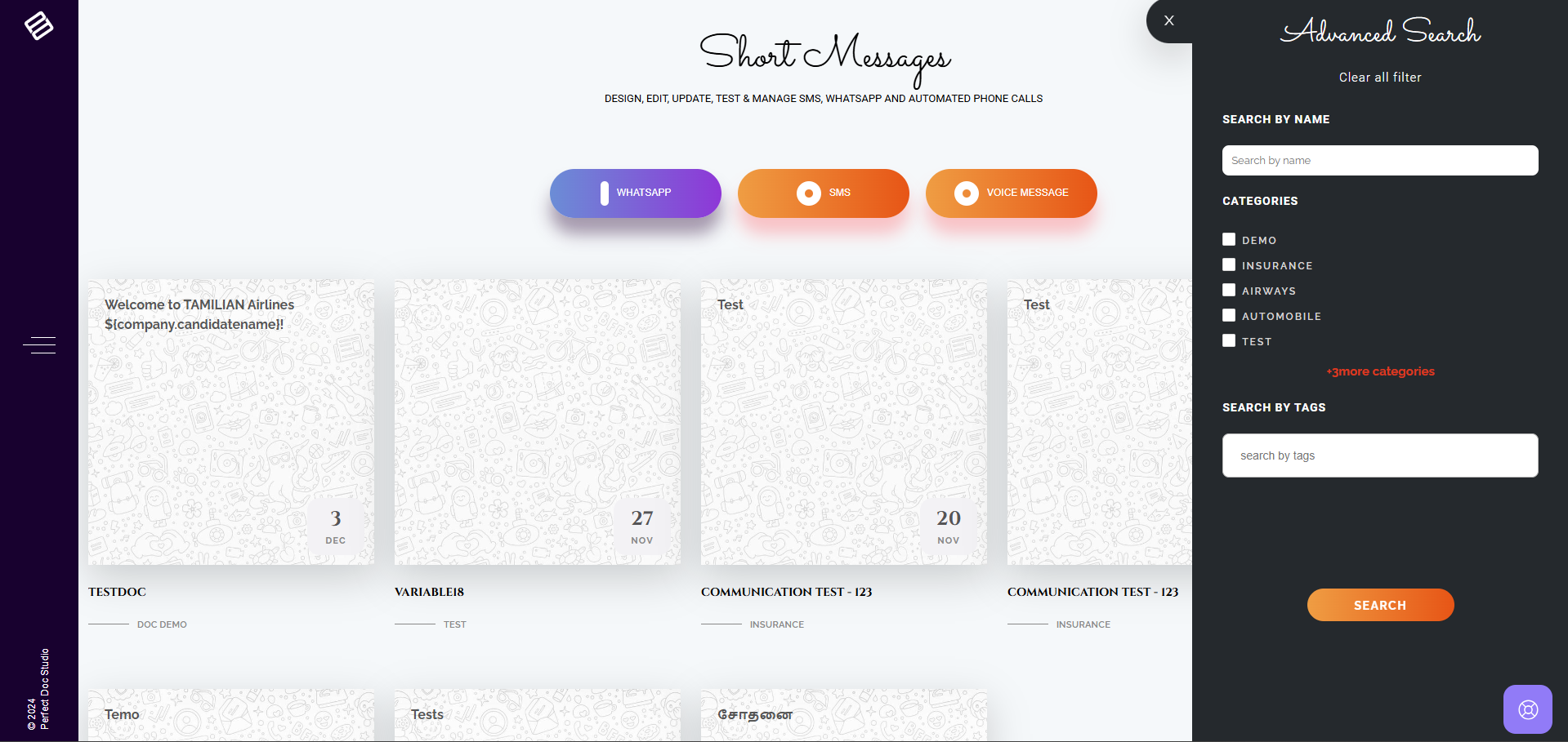 2. Once clicked, a Side bar appears, where you can search for the SMS templates based on the name, categories, tags and status of the document.