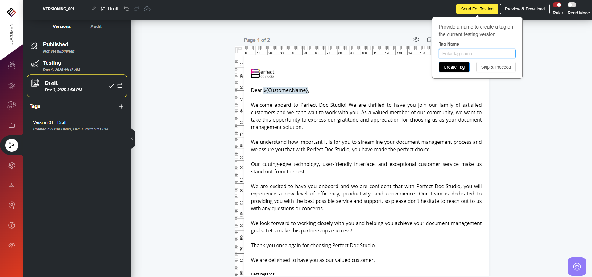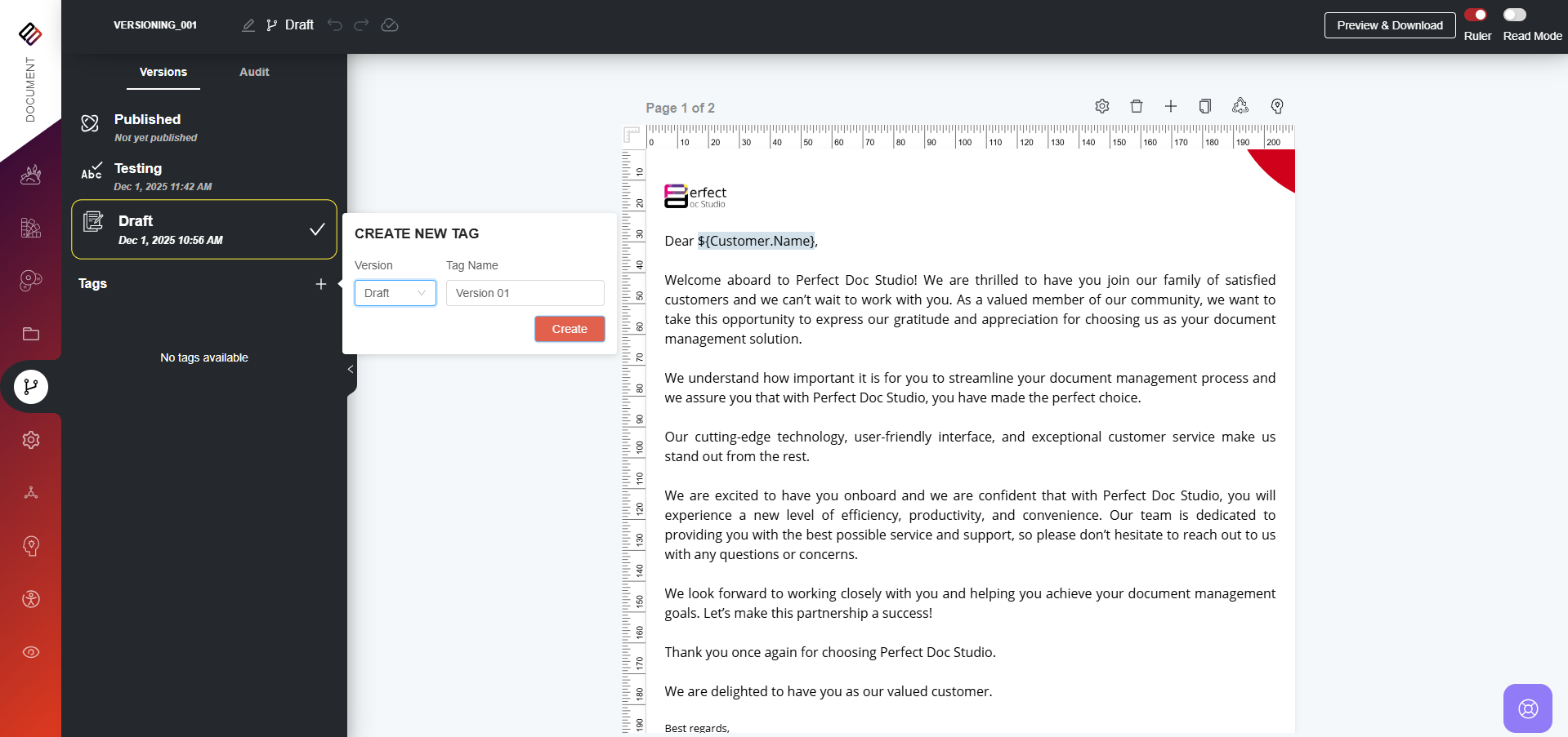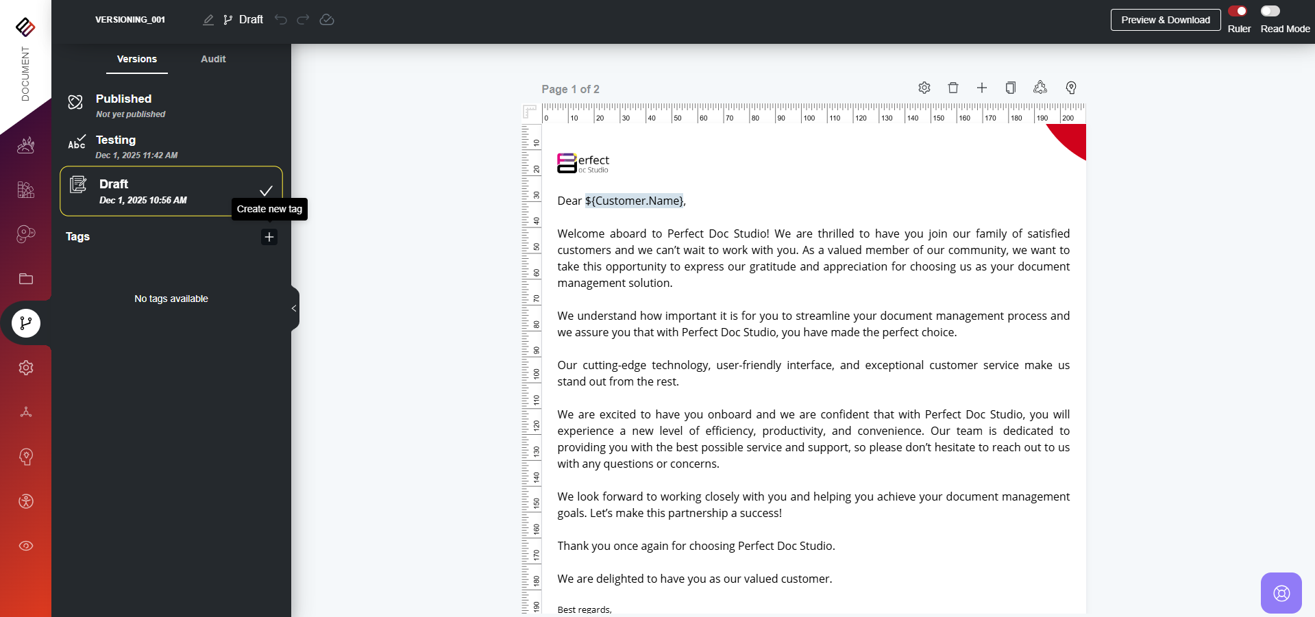 How to Create a Tag? To create a Tag for your document version in Perfect Doc Studio, follow these steps:
