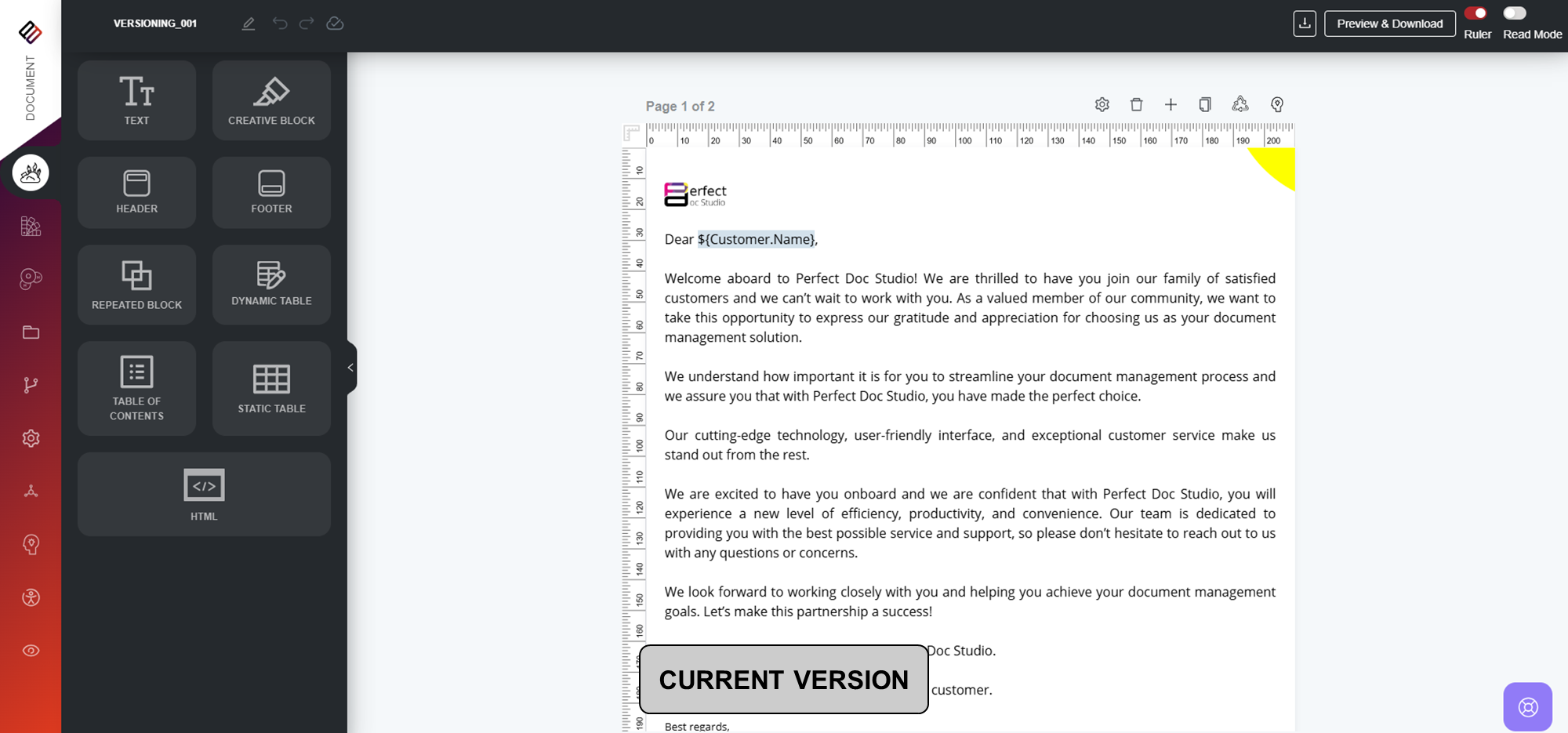 Tags allow you to save a specific version of your document design that you may want to refer back to or reuse later. They are especially helpful when you want to retain a copy of your current design before making further updates.