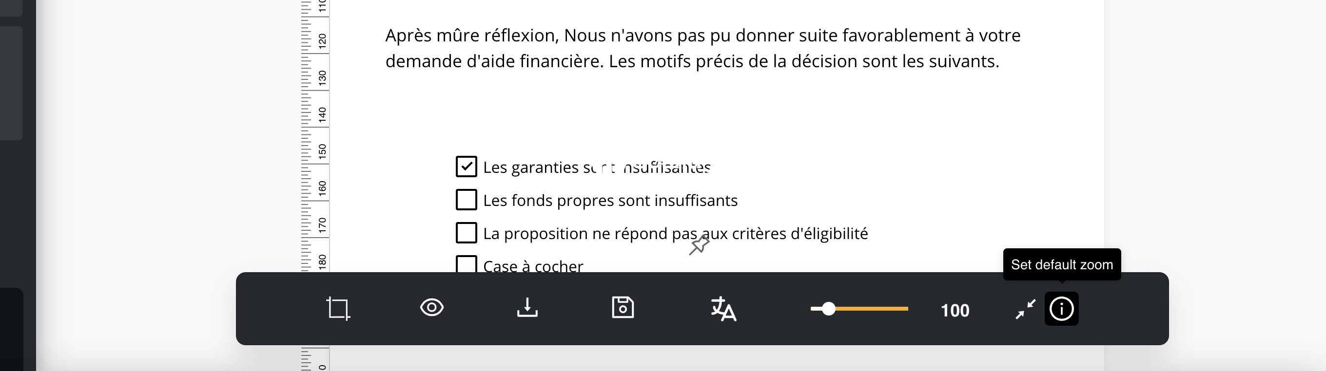 ドキュメント テンプレートのズーム レベルを調整するには、下部パネルに移動し、スライダーを使用して希望のズーム レベルを設定します。 このズーム レベルをブラウザのデフォルトにしたい場合は、設定を保存するオプションを選択できます。 これにより、デザイン画面にアクセスするたびに同じズーム レベルが適用されます。
